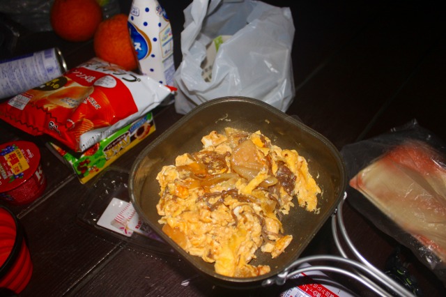 先ほどの卵で包めば美味しいんじゃないかと二人が言うのでやってみることに。