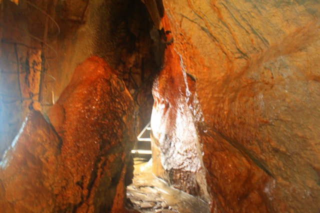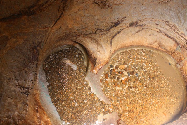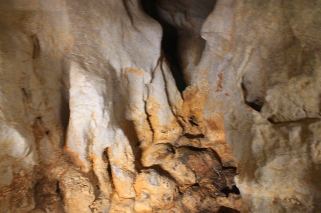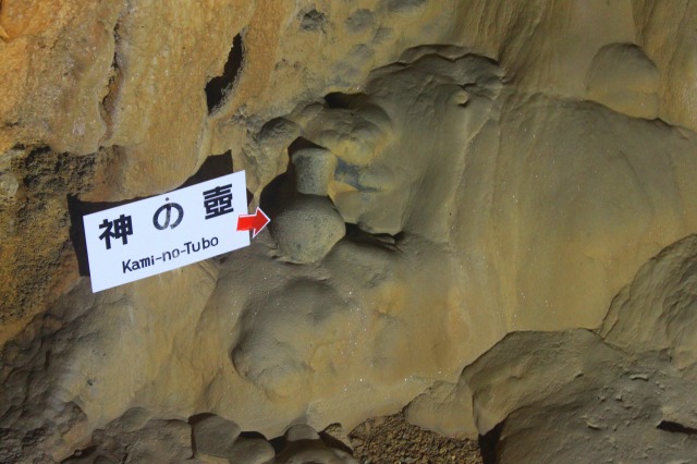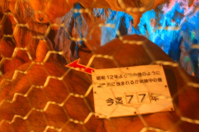 弥生時代に使っていた土器が、長い年月をかけて鍾乳石に包まれているところ。