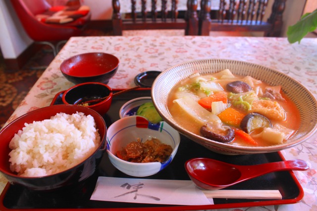 味付けも味噌ベースで、入ってる具もカボチャとかしいたけとか、ナスとかキャベツとか。