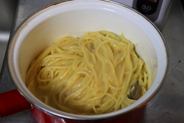 その後、備え付けの鍋使ってスパゲッティを茹でてソースと絡めて食べてから薬を飲む。