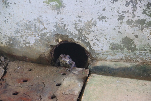 ひょっこり顔を出してるカエル見て。