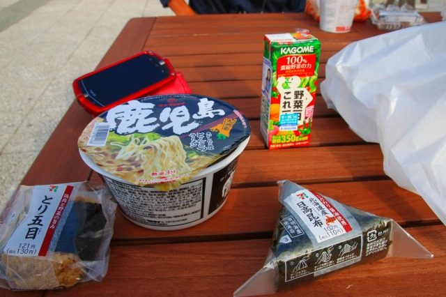 二人が起きてからテントを片付け、隣接しているコンビニでカップらメーンを購入。