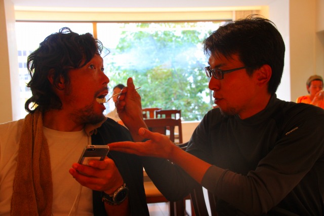 チーズケーキをhina8maさんに食べさせているそっぴーさん。