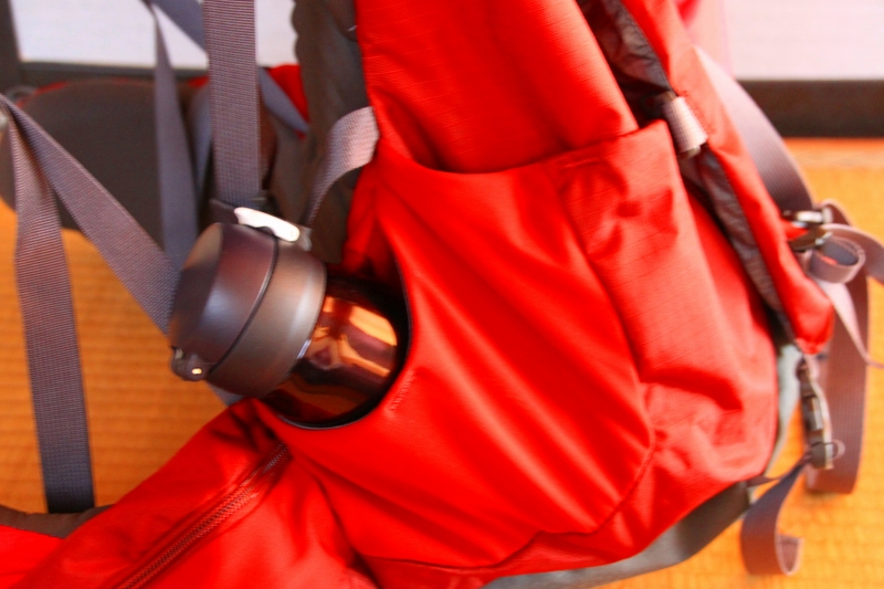 裏側に一つ、表側に二つあり、レインカバーで多少圧迫されているけど容量自体は10Lくらいはありそう。