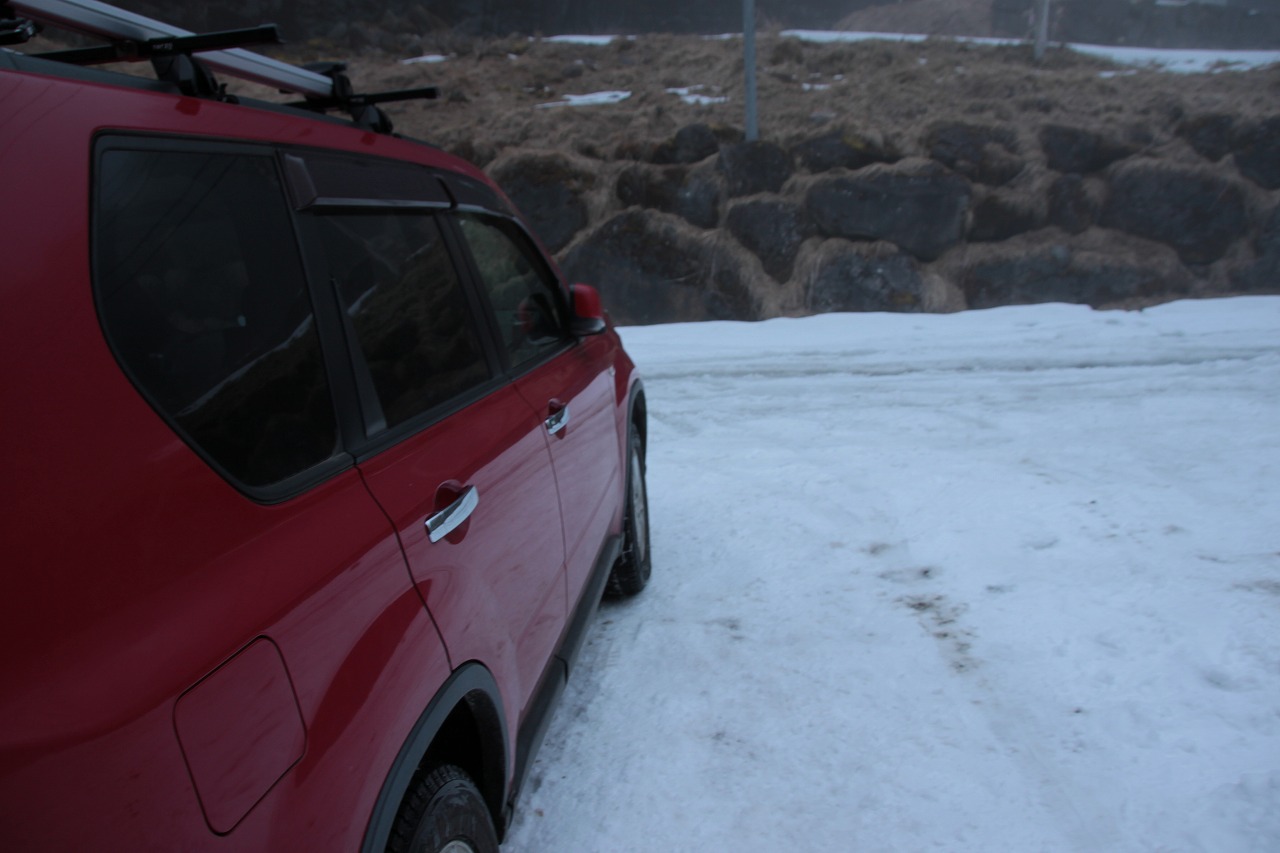 駐車場手前から雪が踏みしめられており、ハンドルを取られる。