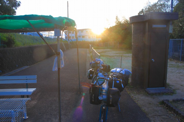 夕日が眩しいけど、朝日の名を冠する公園に到着。