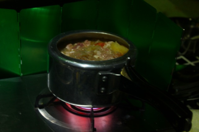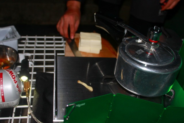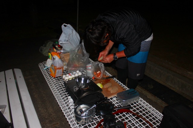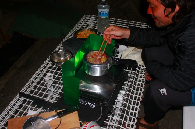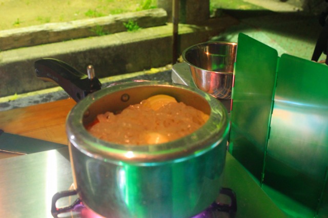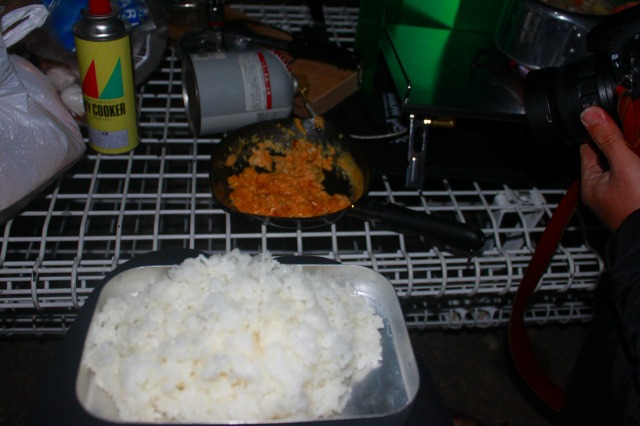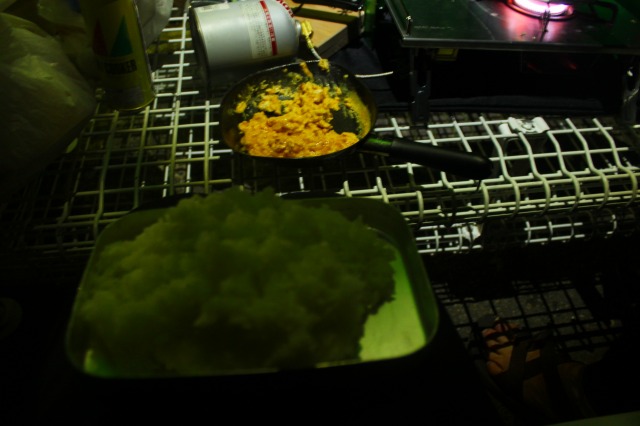 テント内で昨夜のご飯とおかずとで朝食。